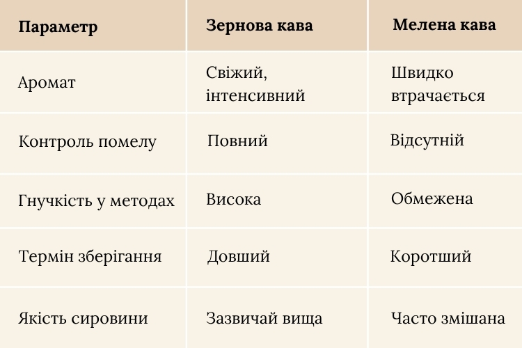 Мелена кава не дає такої гнучкості, адже вона вже стандартизована. Відповідно, зерна надають більше можливостей для експериментів і кращого контролю над процесом.